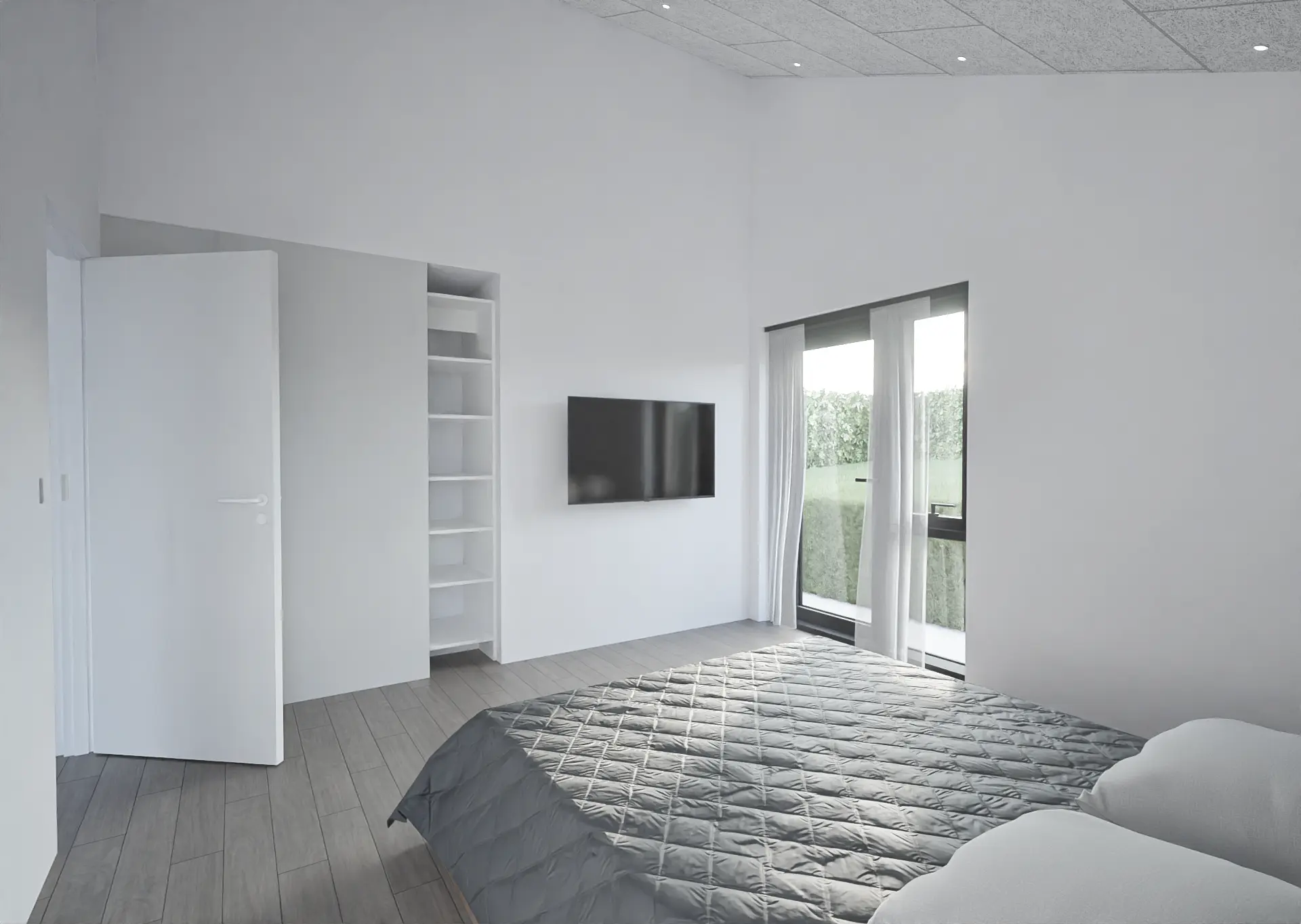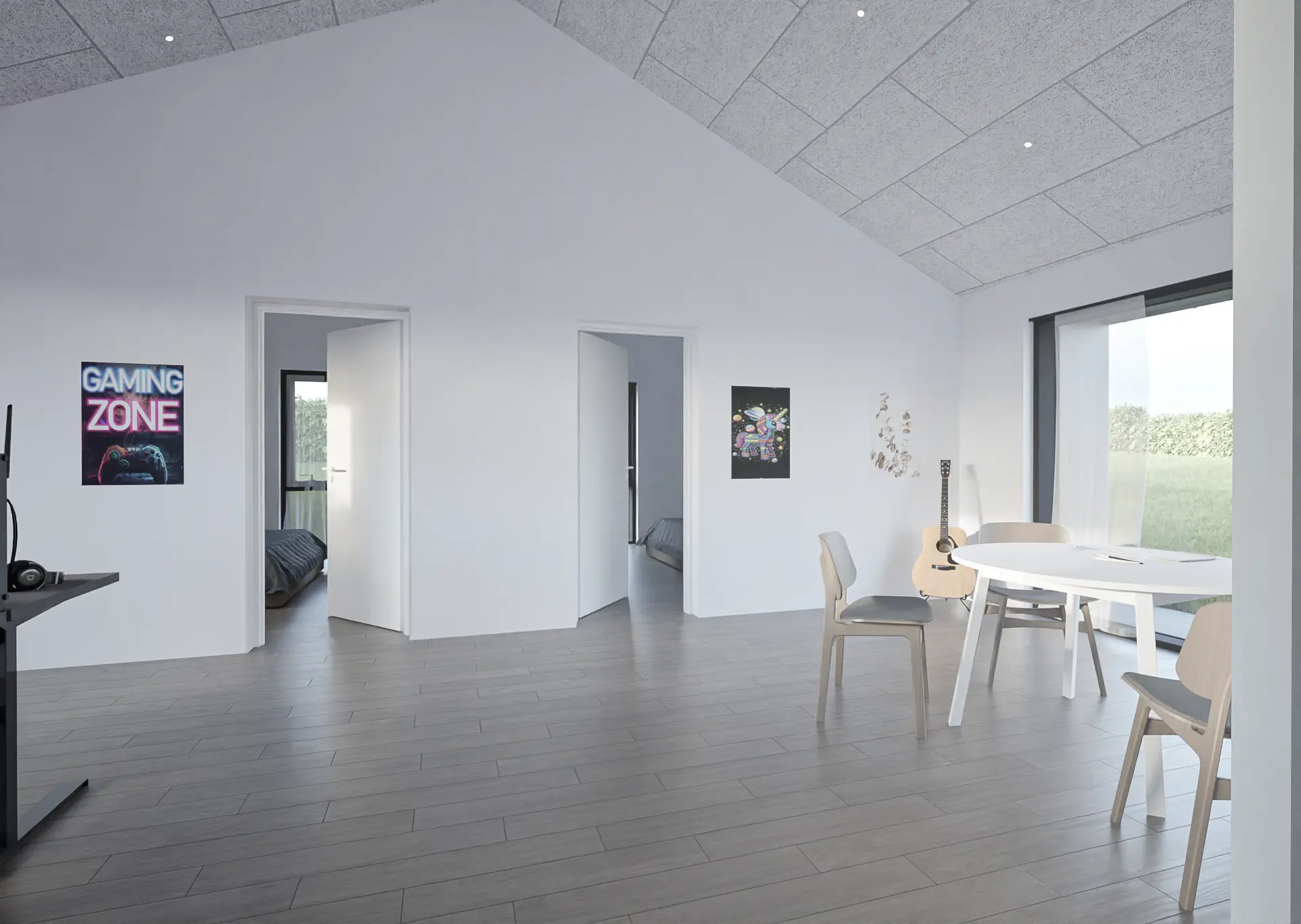 Tilbygningen rummer et nyt multirum samt to værelser, der udvider boligens funktioner og skaber bedre plads til hverdagen. Multirummet fungerer som et fleksibelt opholdsrum, hvor flere aktiviteter kan foregå samtidig.